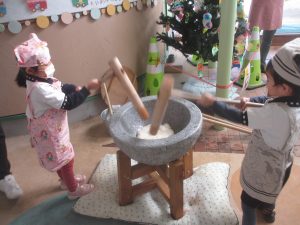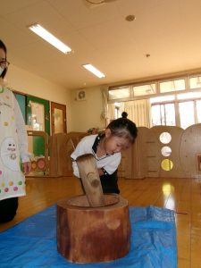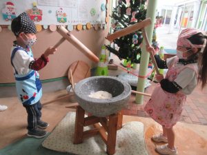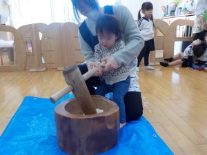 以上児クラスのお友だちは大きい臼と杵でおもちをつきました!