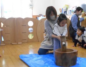 未満児クラスのお友だちは、小さい臼と杵で…😊