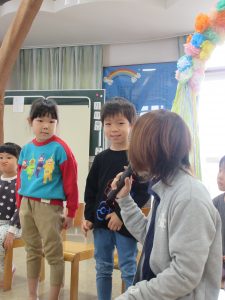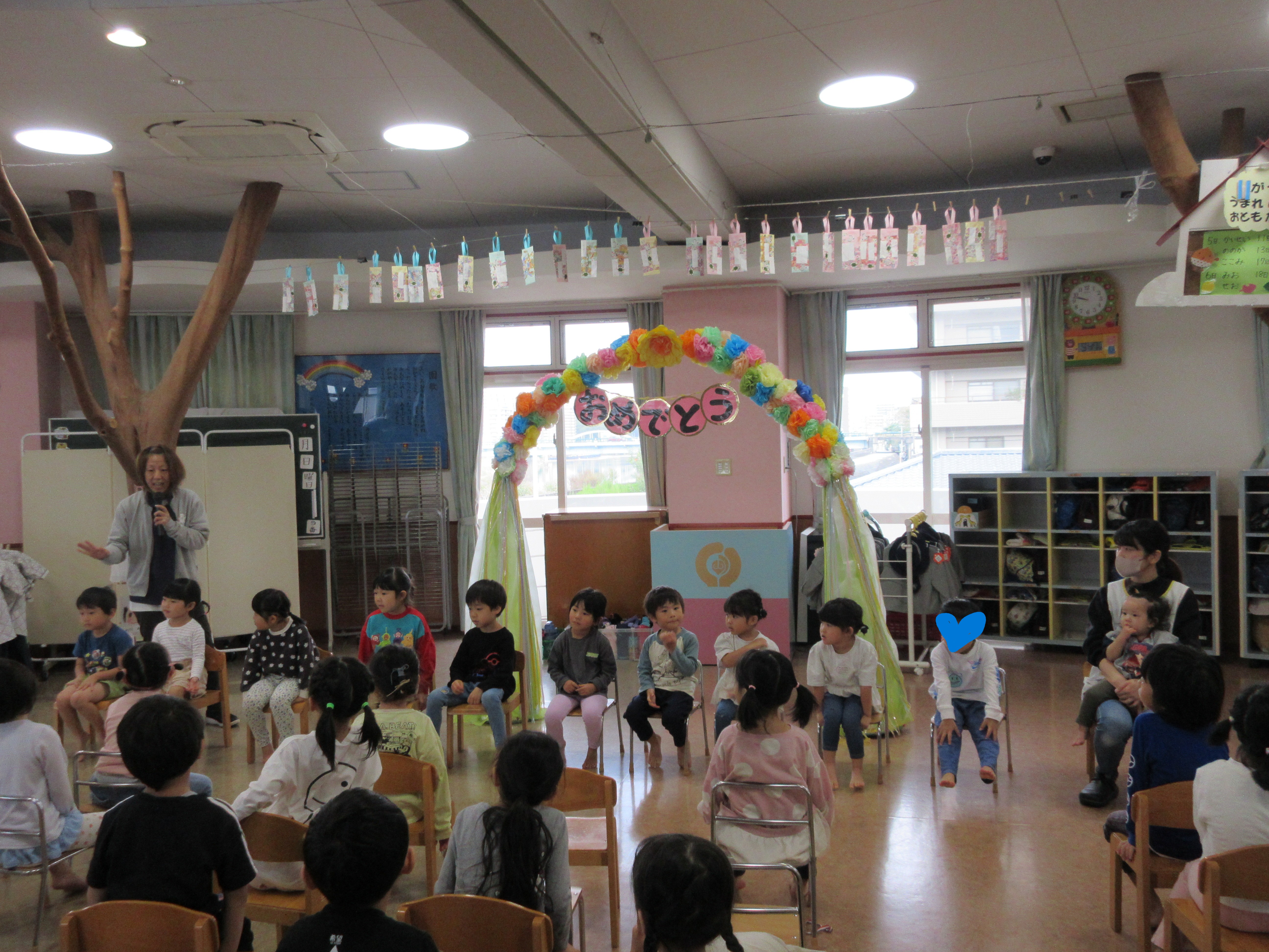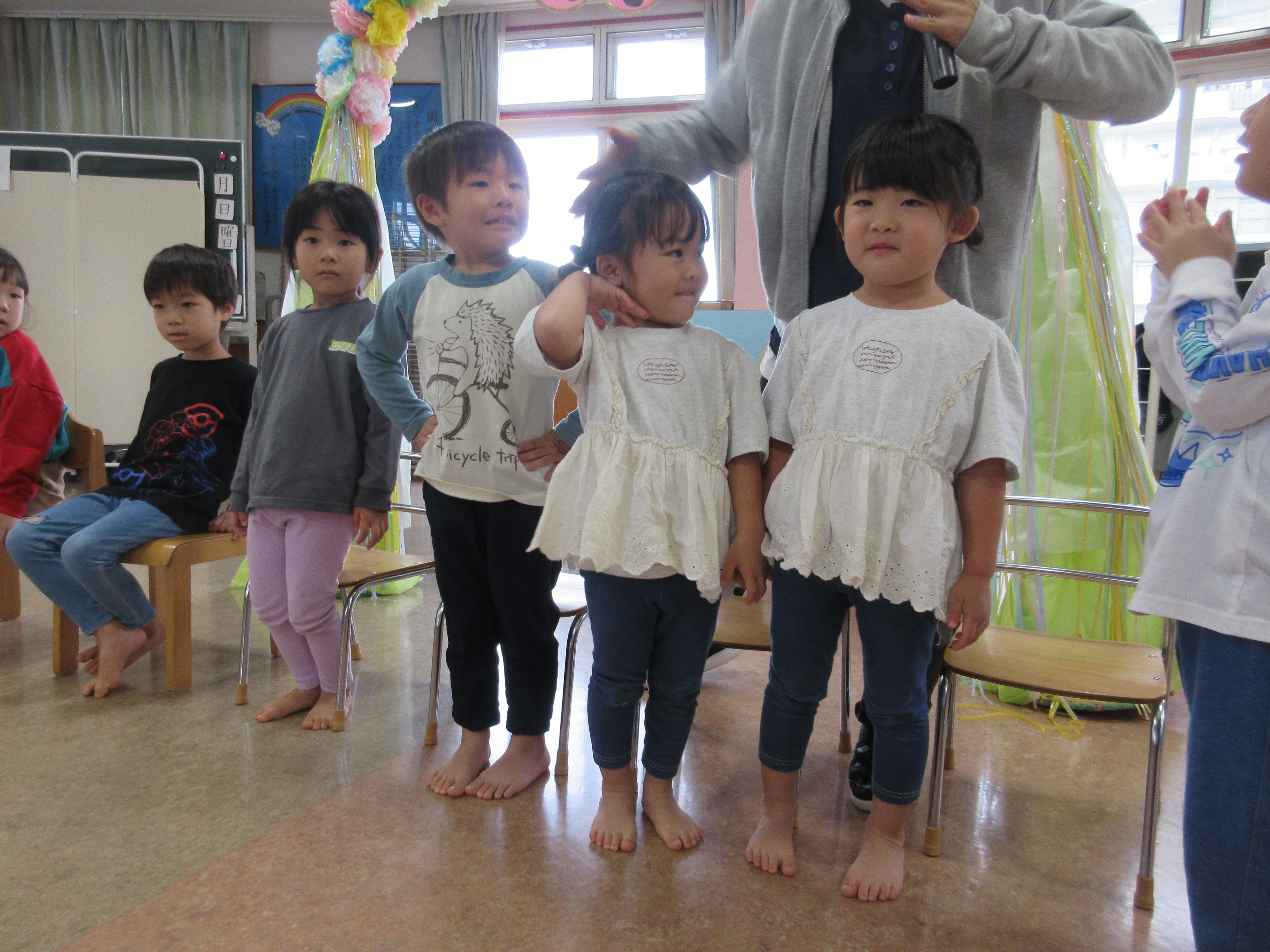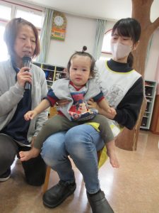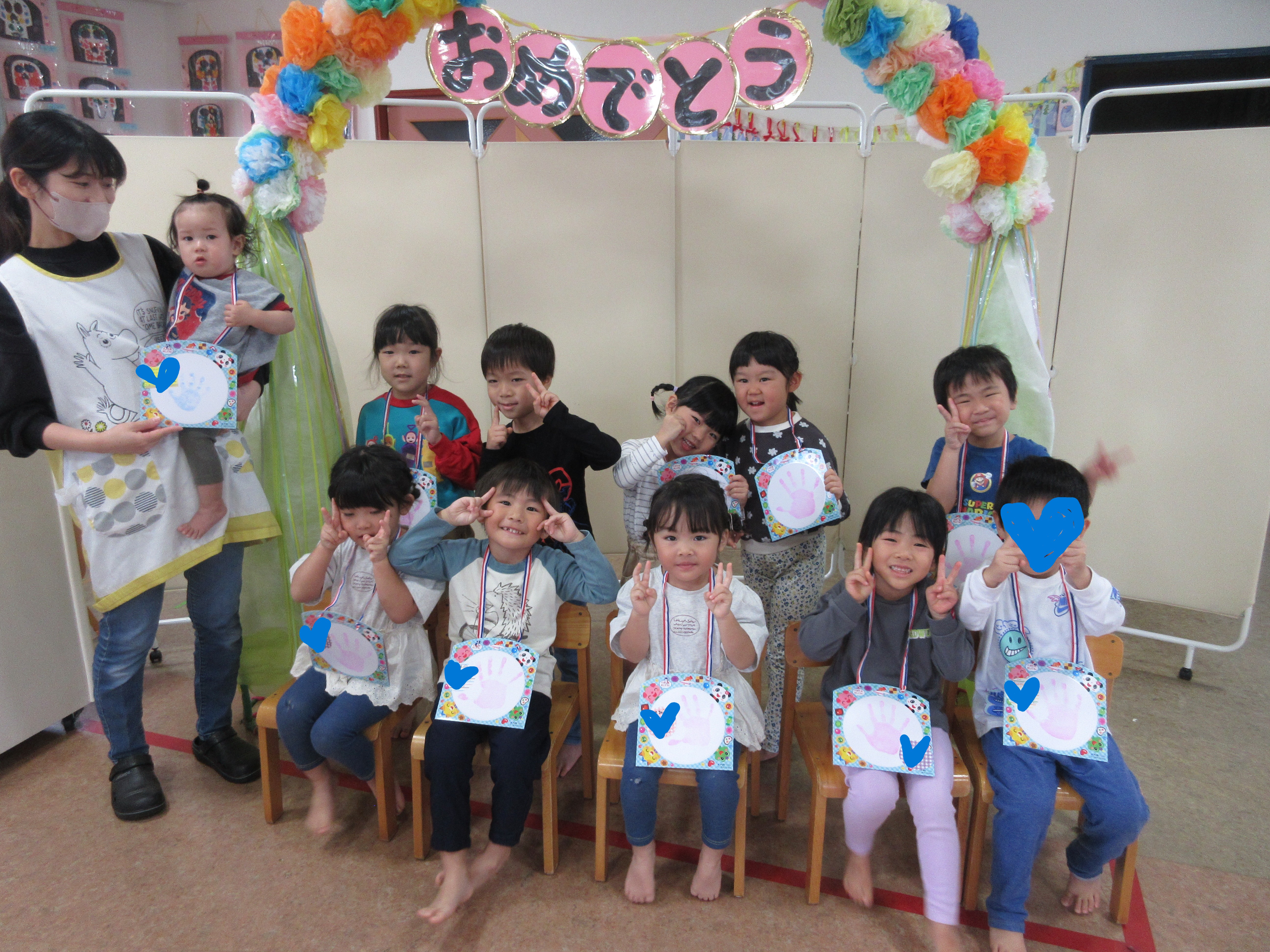 お熱でお休みのお友だちもいて残念でしたが、前月参加できなかった年長児のお友だちも入れて11名のお祝いでした。