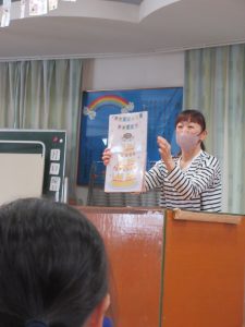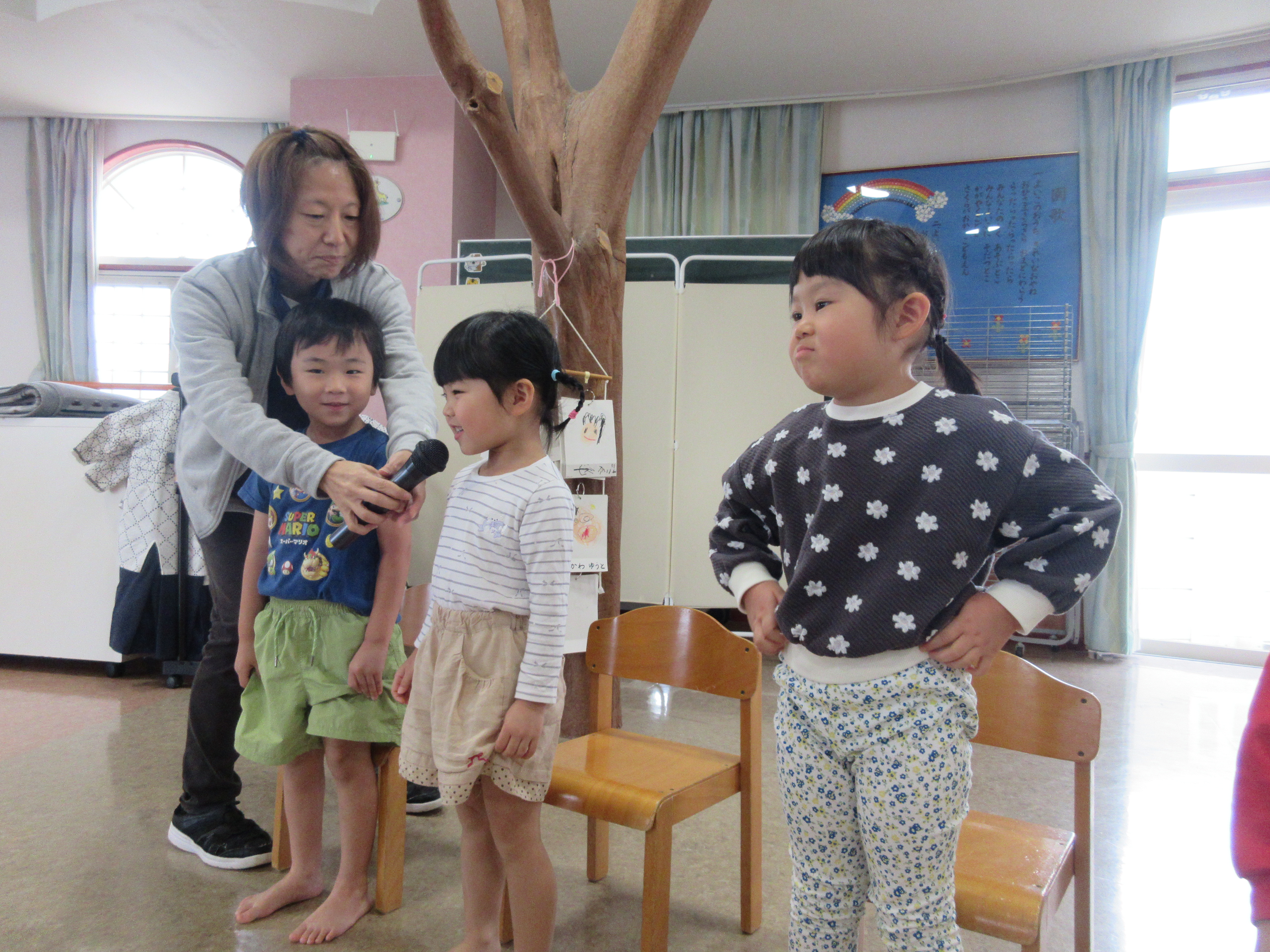 お誕生日のお友だちも笑顔いっぱいで、保育者や友だちの質問に答えてくれました。見ているお友だちもお話をよく聞いてくれ、お誕生日の歌や「おめでとう!」の言葉を元気いっぱいにプレゼントしてくれました。 6歳になった子の手形と1歳になった子の手形を比べてみると、「ちいさい」との声。また、「小さいお友だちが困っていたらどうする?」との問いに「優しくする」「教えてあげる」「一緒に遊んであげる」との声。体はのびのびと、心は優しく大きくなっている子どもたちを感じることができ、嬉しくなりました。