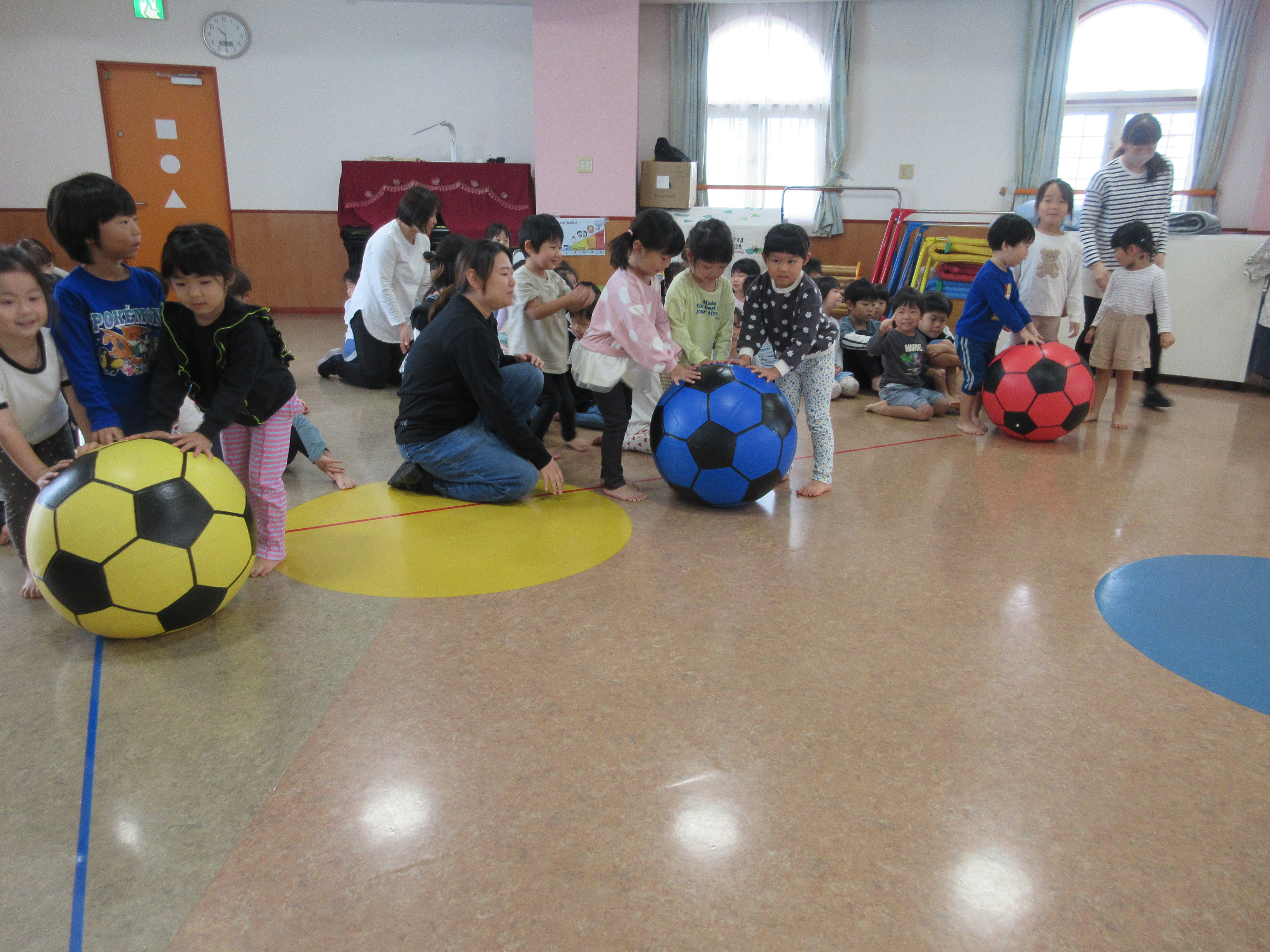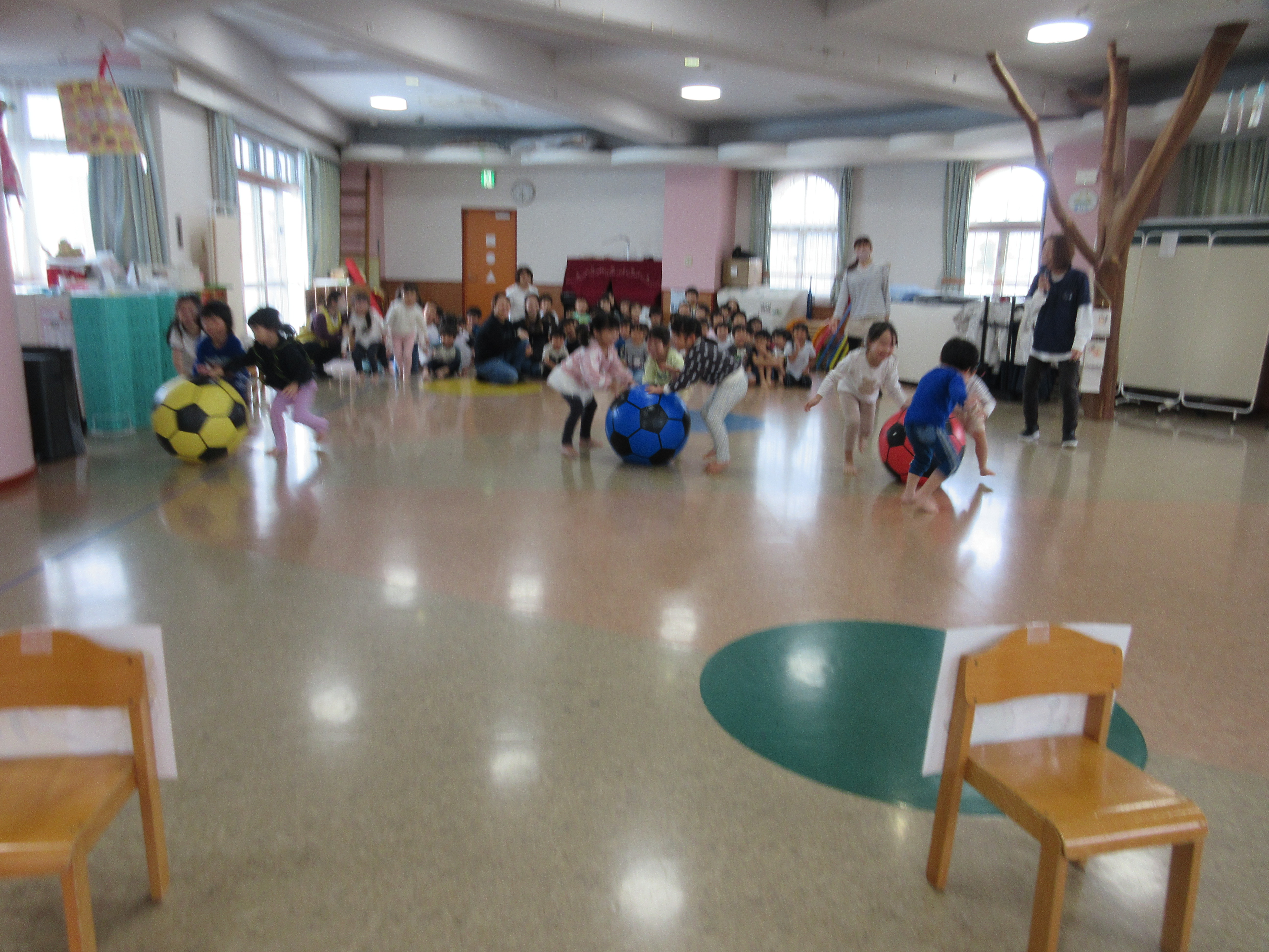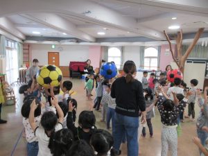 お楽しみのゲームは異年齢児グループでの大玉転がし!ゲームの前からワクワクが止まらない様子の子どもたちで、ゲームは大盛り上がりでした。何といっても、先生たちが自分のチームを勝たせようと何度も「がんばるぞー」と気合を入れていて、とても白熱した戦いになりました。こどもたちがゲームを通して、気持ちを合わせワンチームになったことが一番の収穫だったように感じます。