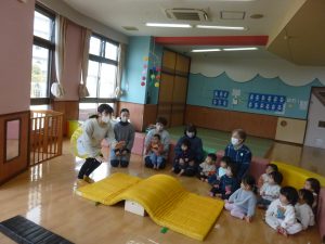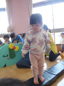 平均台は、牛乳パックで作った低いタイプのもので、怖がることもなく、渡ることができました。最後まで渡りきると笑顔の子どもたちでした。