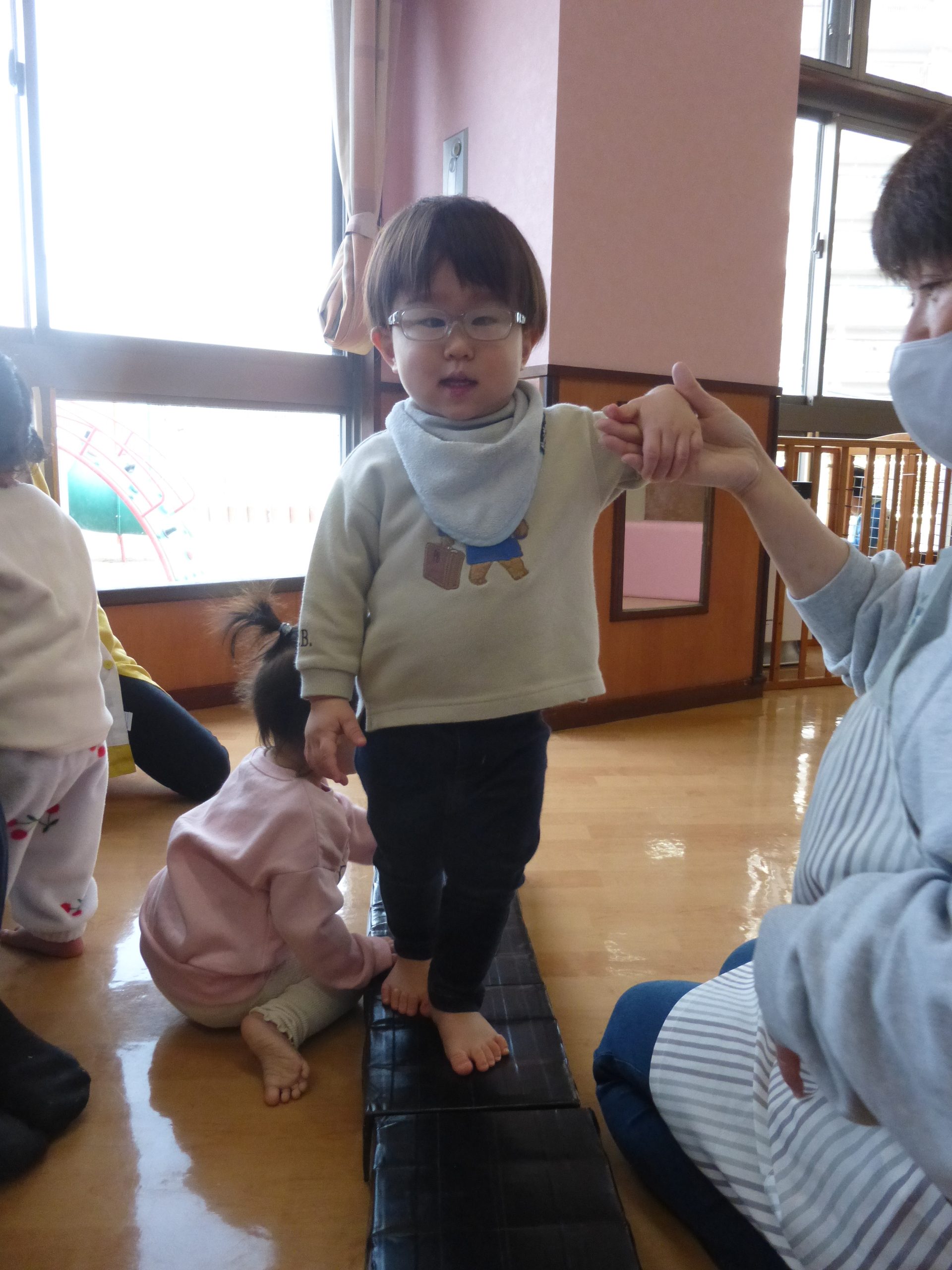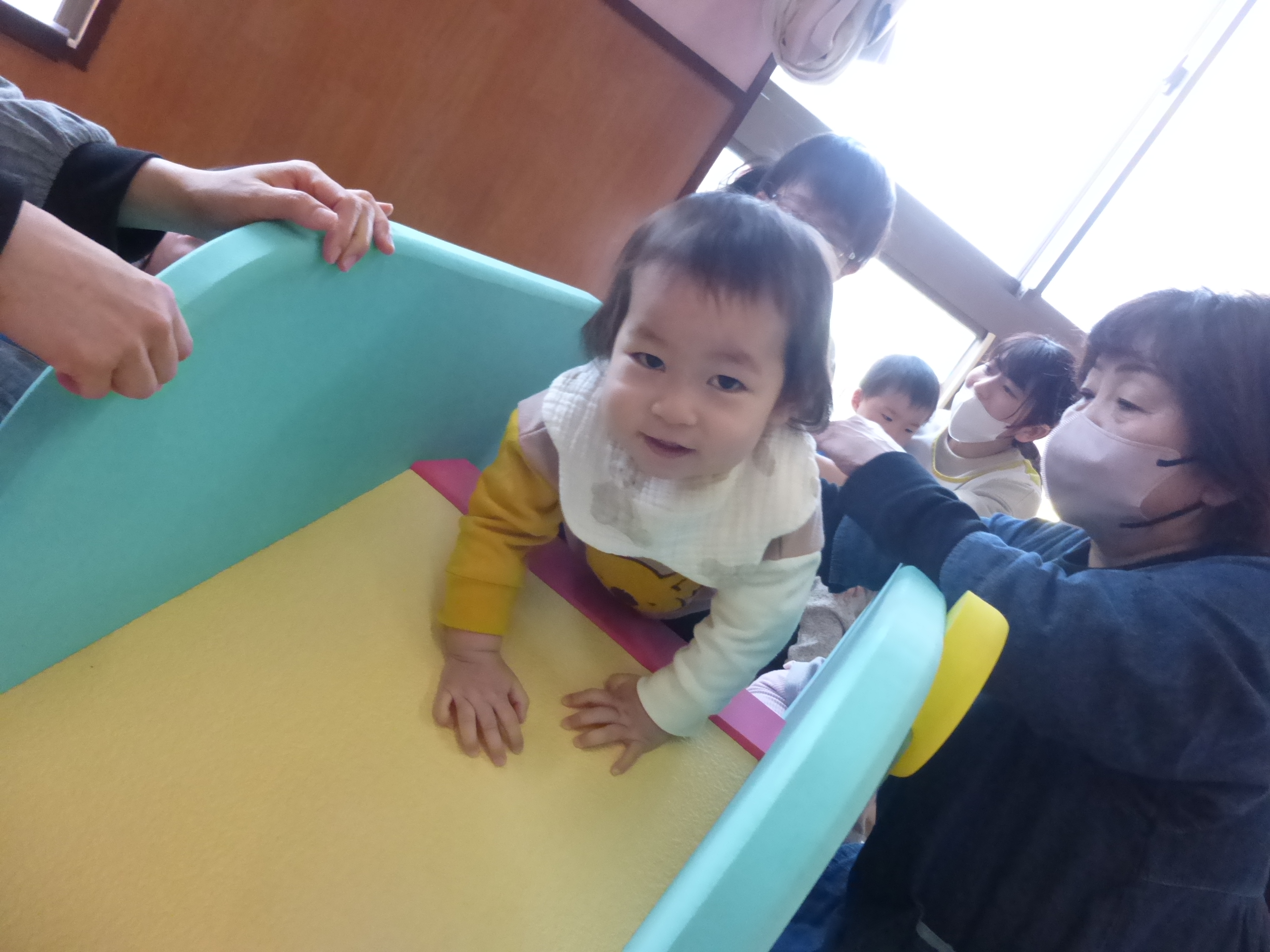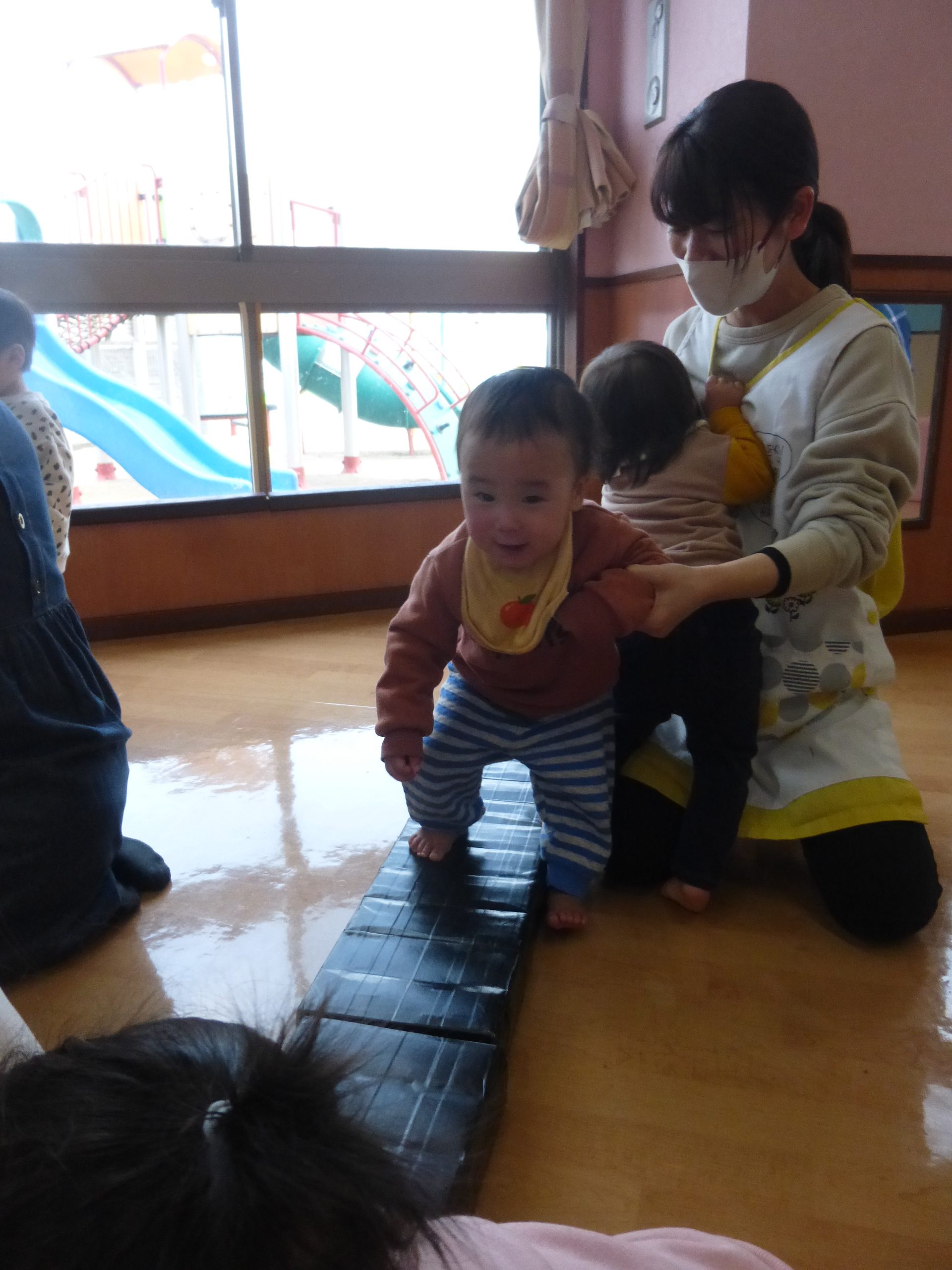 マットの山は、ハイハイで上り下りする子が多かったのですが、歩いての上り下りに挑戦する子もいました。友だちと競うように進んだり、楽しみながら身体を動かしました。