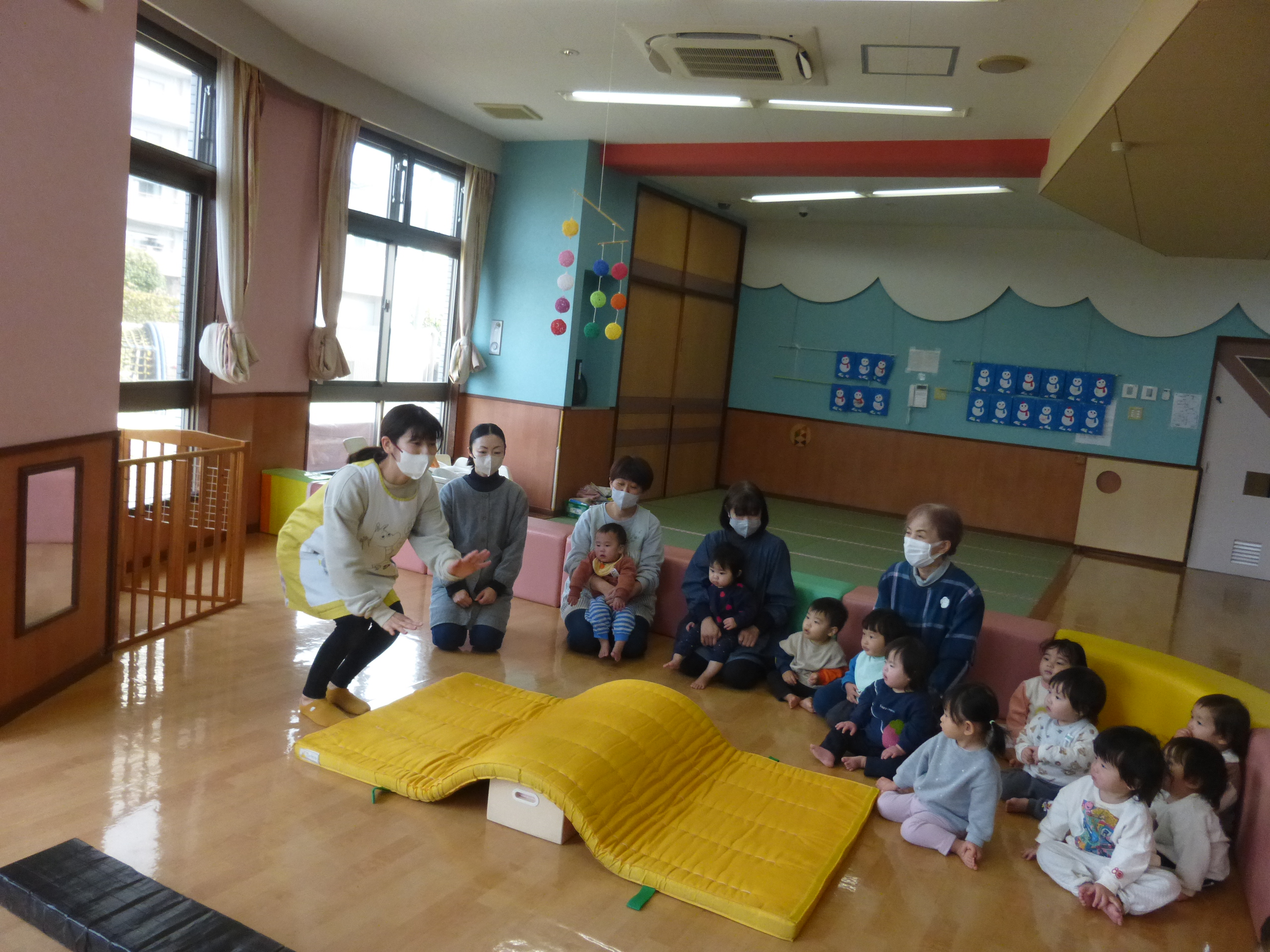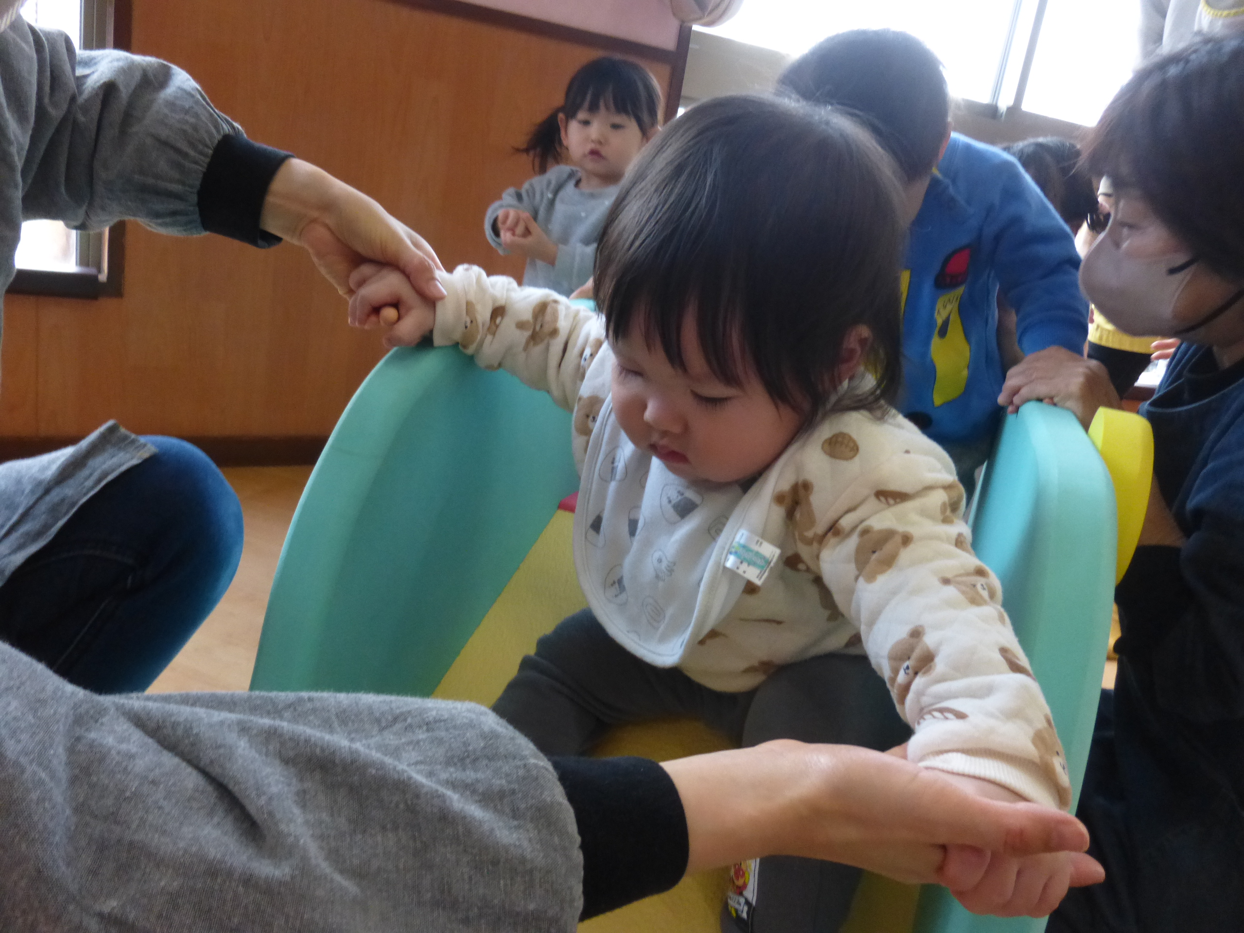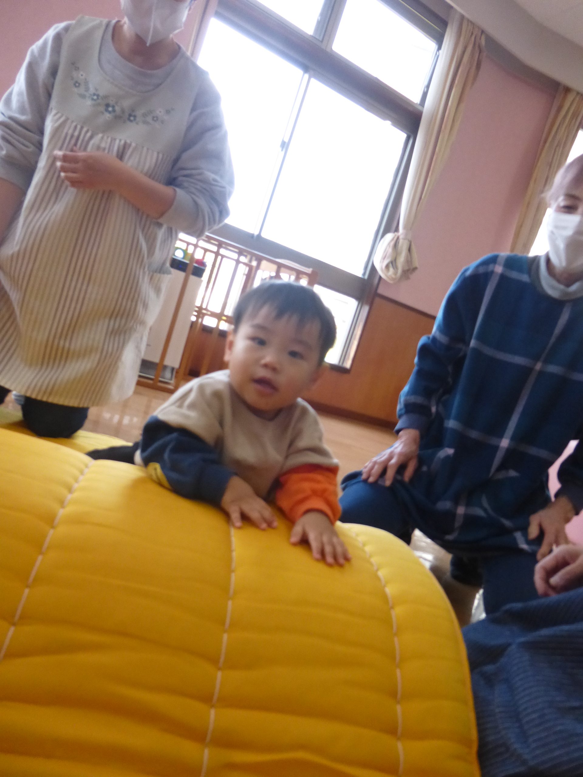 マットの山は、ハイハイで上り下りする子が多かったのですが、歩いての上り下りに挑戦する子もいました。友だちと競うように進んだり、楽しみながら身体を動かしました。