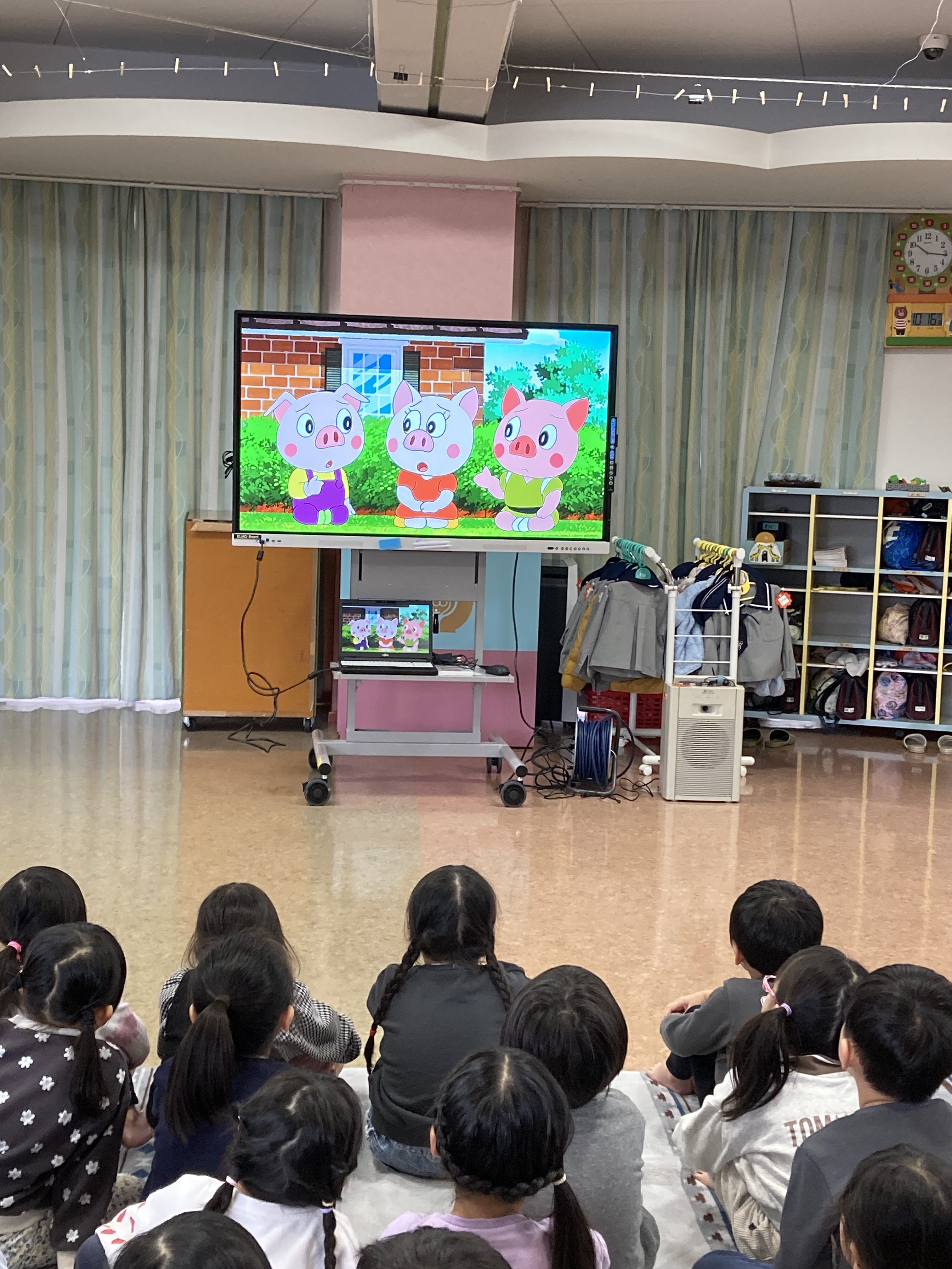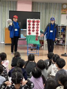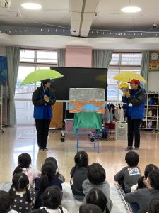 猫の「できるにゃん」を使って、雨の日の傘のさし方や、道路の歩き方、横断歩道の渡り方を教えてもらいました。