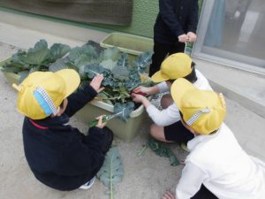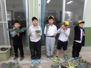 大きくなったブロッコリーの収穫をする。大きくなっていたので子ども達もびっくりしていた。