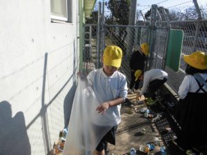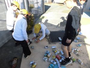 エコ活動でアルミ缶つぶしをする。