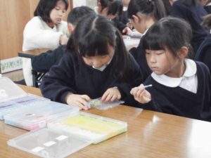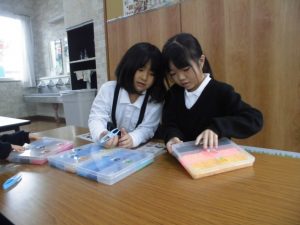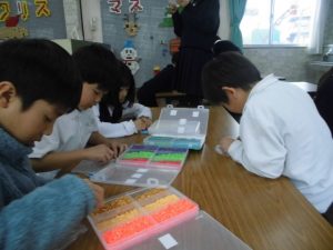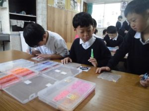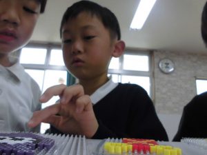アイロンビーズ制作をする。自分たちで作りたい物を選んで見本を見ながら集中して制作していた。