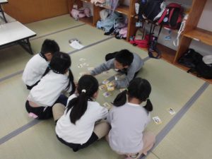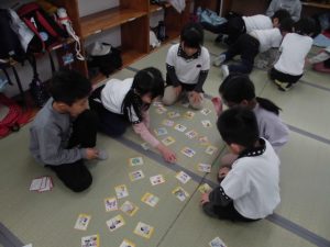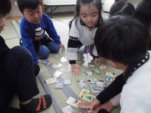 桜ヶ丘こども園の園児と3年生が一緒になって交流をした。読み札を3年生が行い、取り札を園児が一生懸命取っていた。