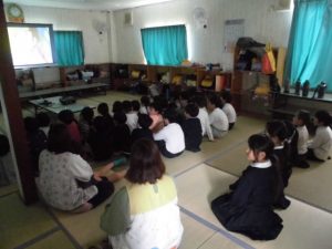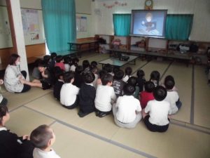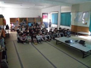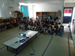映画鑑賞会をする。こども園の園児を招いて「クレヨンしんちゃん」の映画を観た。約束を守り静かに観ることができた。大声をあげて笑う子ども達。