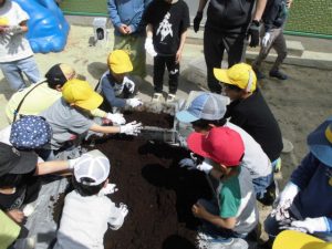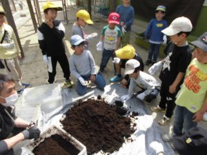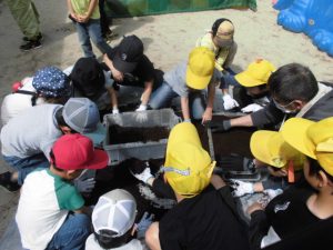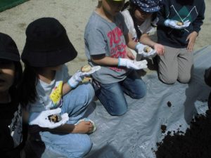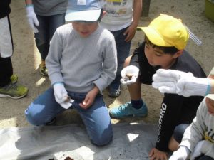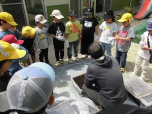 カブト虫観察会をする。箱の中から大きな幼虫が出てくると驚いていた子どもたち。
