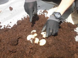 手で優しく触り重さや感触を楽しんでいた。触った後は箱に優しくなおし土を被せた。