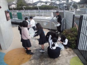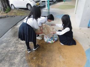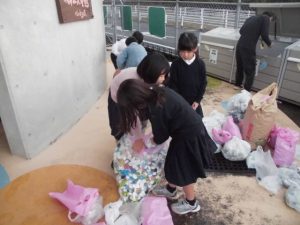 小雨の中元気な子ども達はペットボトルキャップを大きな袋にうつしてくれた。