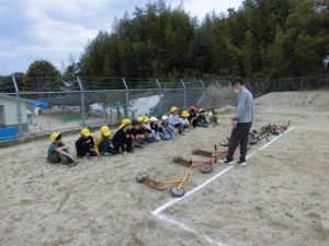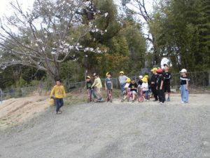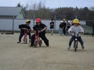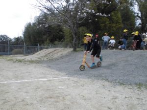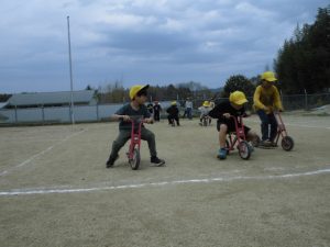 お友達同士で競争をする。負けないように地面を一生懸命蹴って頑張っていた。勝ったら喜び、負けたら悔しがる姿が見られた。