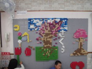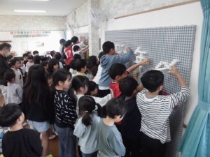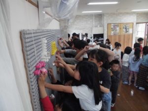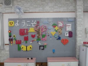 こども園の園児を招いて交流をする。初めにBブロックで壁面を作り、その後外に出て鬼ごっこをして遊んだ。