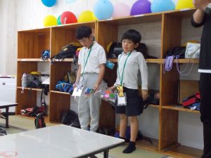 2・3年生からプレゼントをもらった1年生は喜んでいた。その後は、約束と過ごし方を説明して施設内を探索した。
