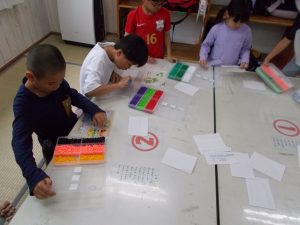 アイロンビーズをする。自分たちで作る個数を話し合って好きなキャラクターを作る。