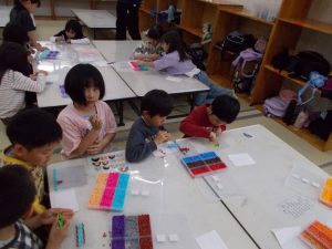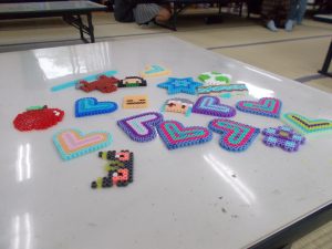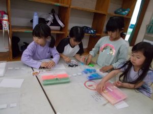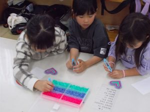 作った作品は大事に保管していた。片付けの時にアイロンビーズがごちゃ混ぜになり一生懸命頑張って片付けをしていた。